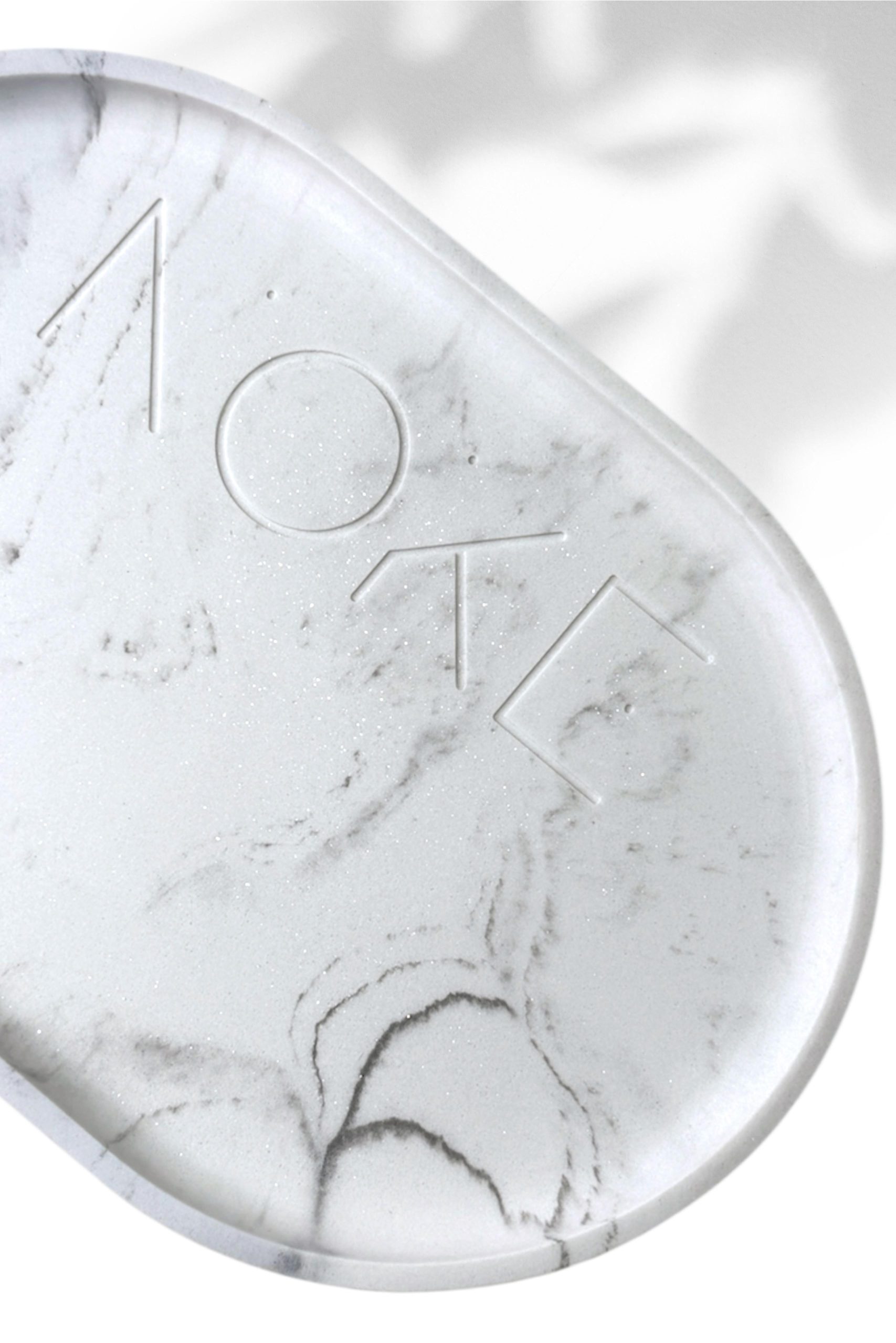The tray has a luxurious yet minimalist look, with a sculpted marble effect.