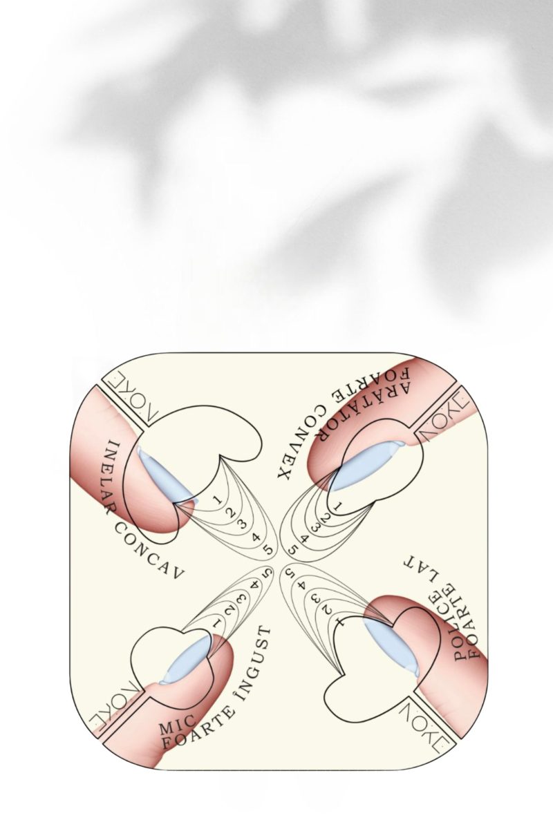 • Marcajele de pe șablon au lățimi diferite în funcție de deget, iar dacă urmezi conturul lor obții unghii OVALE sau MIGDALATE perfecte.